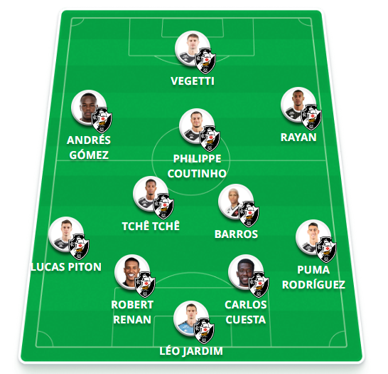 Provável escalação do Vasco: Léo Jardim, Puma Rodríguez, Cuesta, Robert Renan, Lucas Piton, Barros (Hugo Moura), Tchê Tchê, Coutinho, Andrés Gómez, Rayan e Vegetti (David).