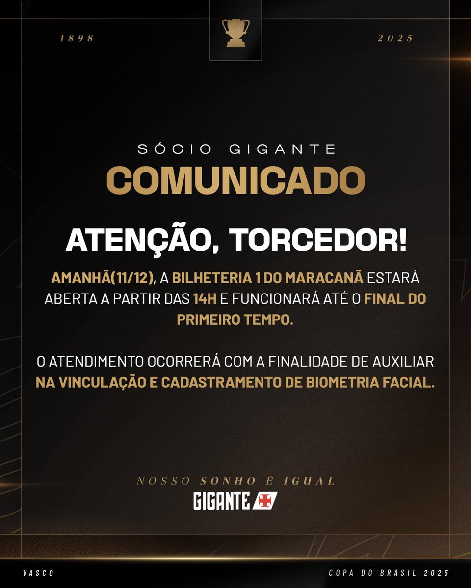 Sócio Gigante alerta para o horário de atendimento no Maracanã para Vasco x Fluminense