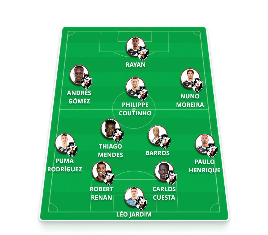 A provável escalação do Vasco: Léo Jardim, Paulo Henrique, Carlos Cuesta, Robert Renan e Puma Rodríguez, Barros, Thiago Mendes e Coutinho; Nuno Moreira, Andrés Gómez e Rayan.
