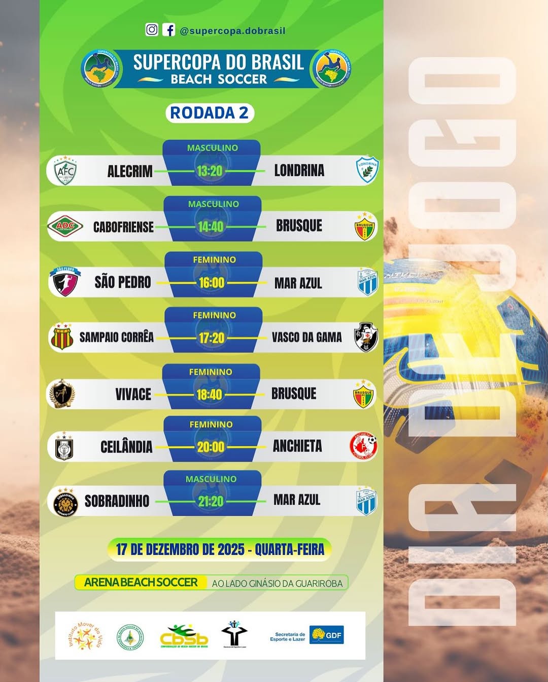 📍 Arena Beach Soccer – ao lado do Ginásio da Guariroba