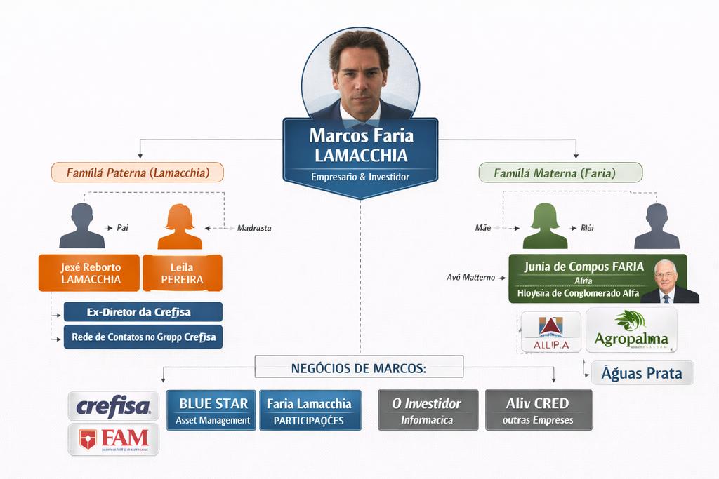 Fora das redes, o cenário muda. Marcos está ligado a duas famílias tradicionais do sistema financeiro brasileiro: LAMACCHIA e FARIA.
