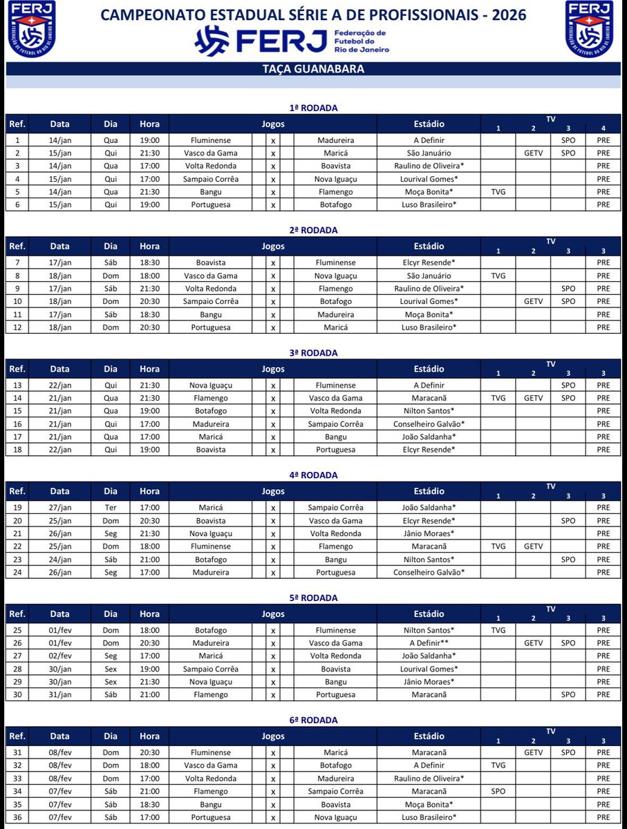 🚨💢⚽️ Vasco estreia no Campeonato Carioca 2026 no dia 15 de janeiro (quinta-feira), às 21h30, contra o Maricá, no Estádio de São Januário.
