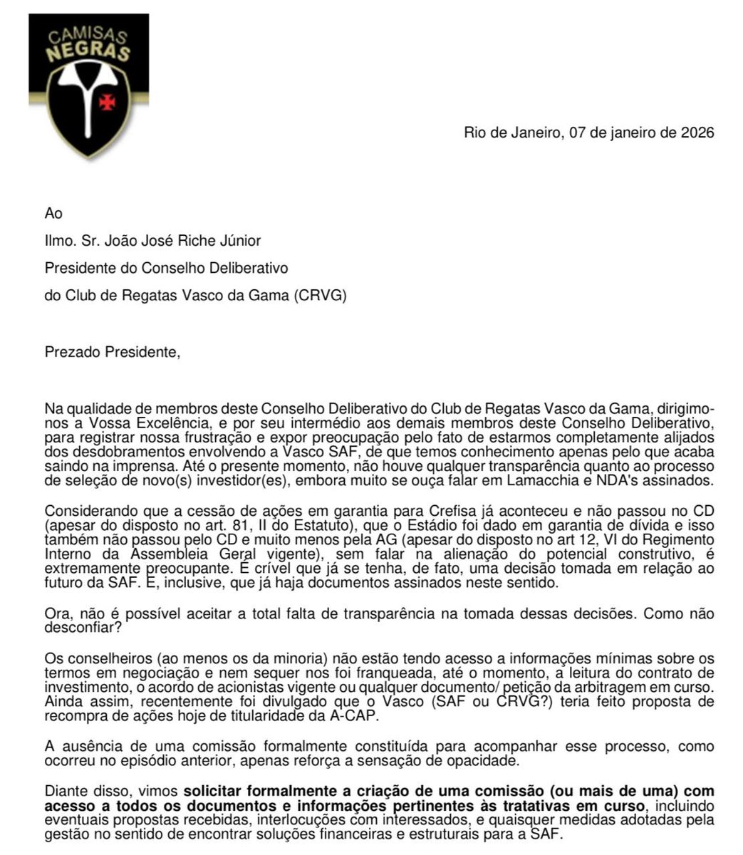 Diante das notícias de que uma negociação está prestes a ser fechada, envolvendo a nossa SAF, os conselheiros do grupo Camisas Negras, eleitos por terem feito parte da Chapa Somamos em 2023, segue