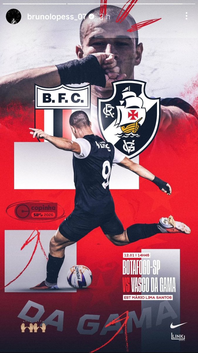 O atacante Bruno Lopes postou essa arte pro jogo entre Vasco e Botafogo-SP, pela 2a fase da Copinha. O jogador, em princípio, era dúvida para a partida. A postagem é um grande indício que vai pra partida. O confronto será disputado em Brodowski, às 14h15, pela Xsports.