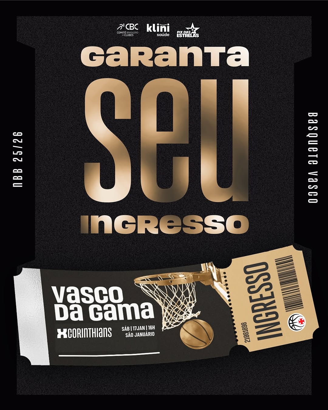 Sábado (17/01) é dia de jogão em São Januário! 🏀😮‍💨 O Vasco da Gama entra em quadra às 16h para enfrentar o Corinthians. 💢 Sócios do Vasco têm direito à meia-entrada!