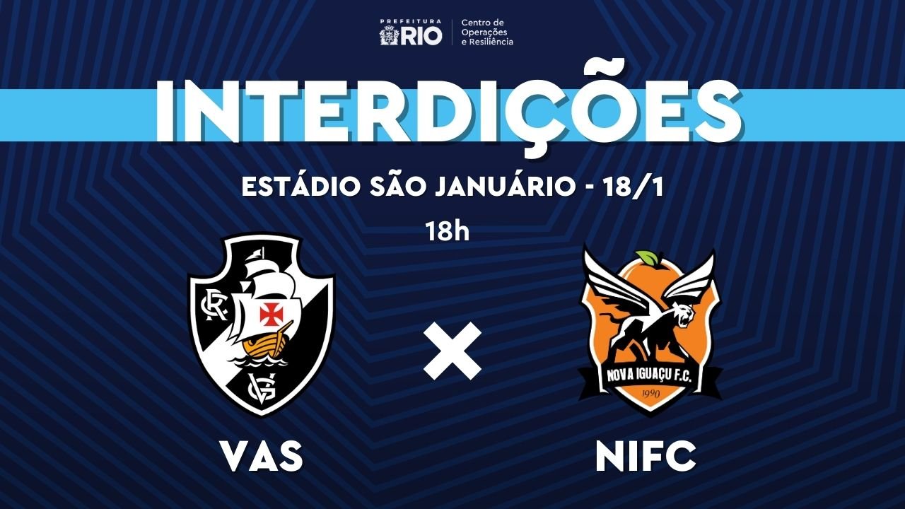 O Centro de Operações e Resiliência da Prefeitura do Rio (COR-Rio) informa que um esquema especial de trânsito será implantado pela CET-Rio, neste domingo (18/1), para o jogo entre Vasco e Nova Iguaçu, pelo Campeonato Carioca. A partida começa às 18h, no estádio São Januário, no bairro Vasco da Gama, Zona Norte da cidade. As interdições ao trânsito de veículos iniciam às 12h.