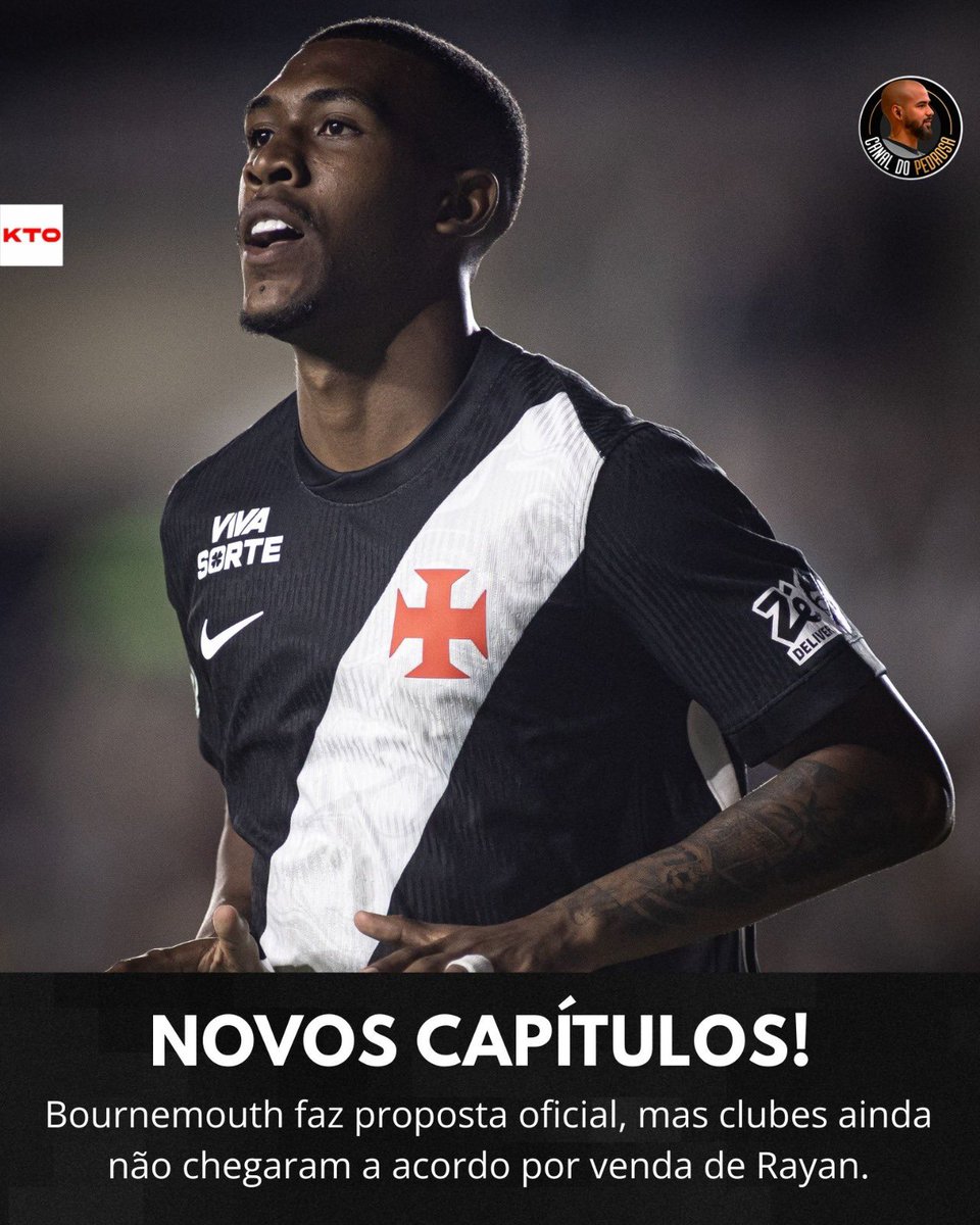 A iminente saída do Rayan está ganhando mais capítulos. De acordo com a apuração do #CanaldoPedrosa, a primeira proposta oficial do Bournemouth chegou, convenceu o atacante e seus representantes, mas o Vasco ainda não aceitou. O clube ainda discute detalhes contratuais e, em paralelo, aguarda a chegada de novas ofertas. Entenda:
