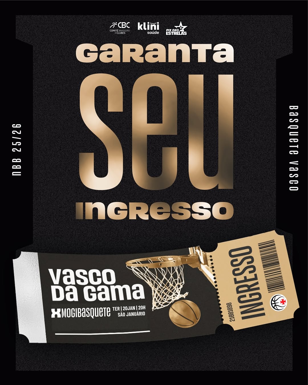 Terça-feira (20/01) é noite de basquete em São Januário! 🏀💢 O Vasco da Gama entra em quadra às 20h diante do Mogi. Sócios do Vasco garantem meia-entrada!