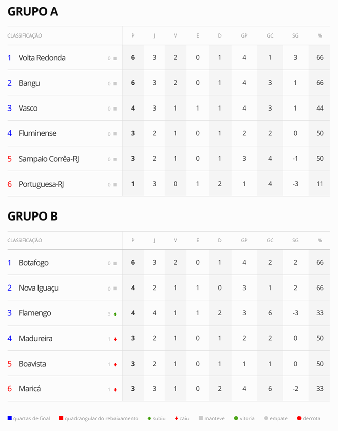 Após os jogos desta 4ª-feira da 3ª rodada da Taça Guanabara, o Vasco, que perdeu para o Flamengo por 1 a 0, está na 3ª colocação no Grupo A. A rodada se encerra nesta 5ª-feira com 3 partidas.