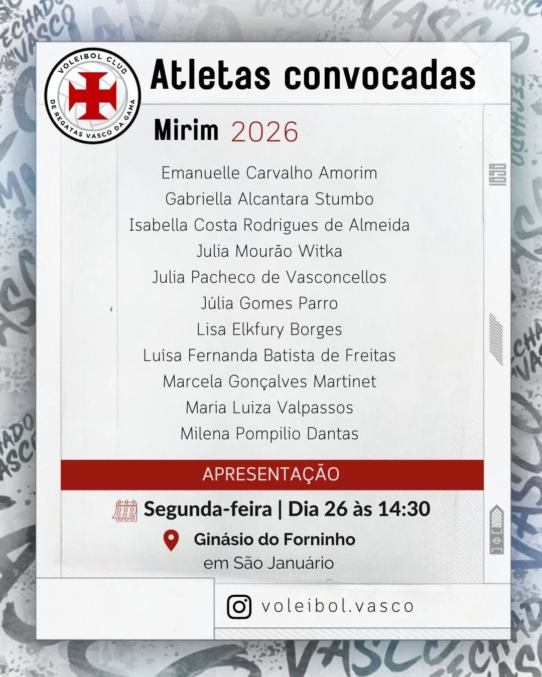 A apresentação da equipe SUB-15 – MIRIM será amanhã, 2a feira, 26/01 às 14:30 no Ginásio do Forninho, em São Januário.