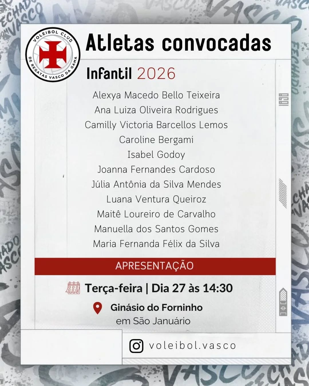 A apresentação da equipe Sub-17 – INFANTIL será 3a feira, dia 27/01, às 14:30 no Ginásio do Forninho, em São Januário.