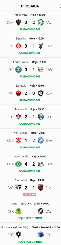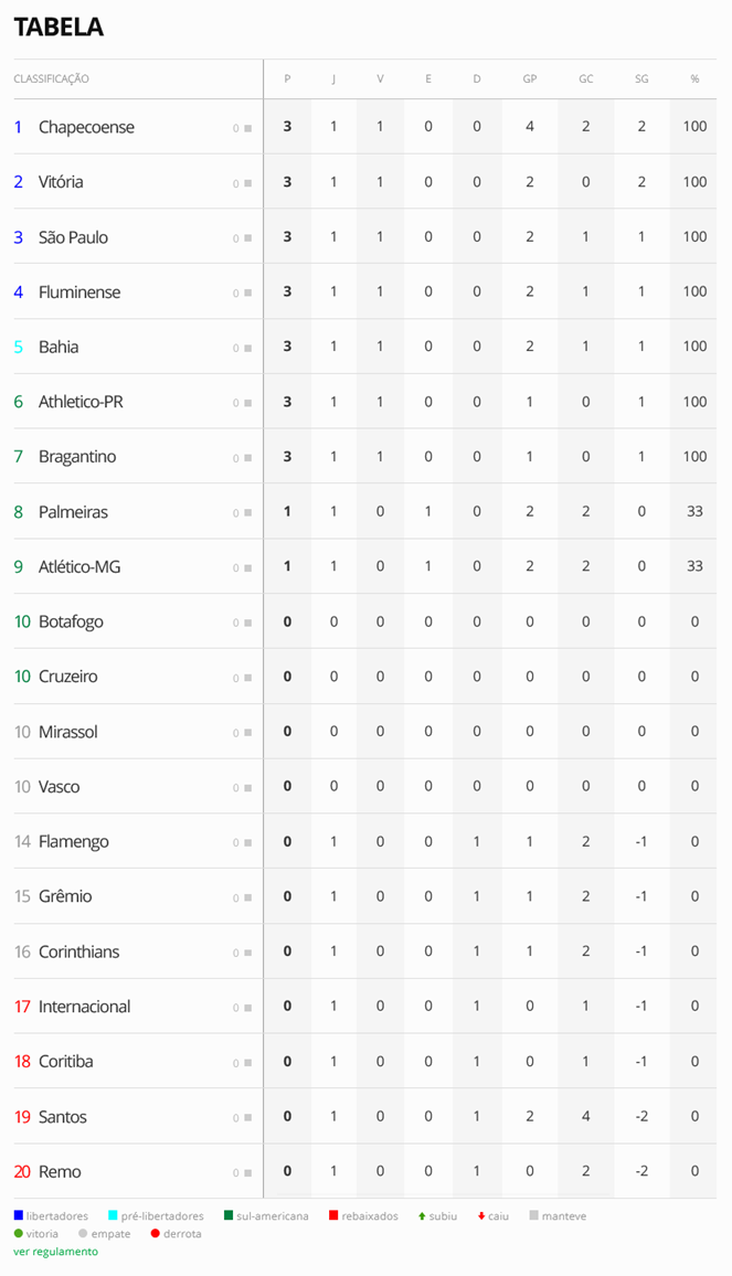 Confira a classificação do Campeonato Brasileiro após os jogos de 4ª-feira da 1ª rodada
