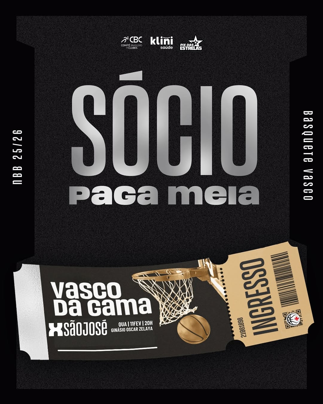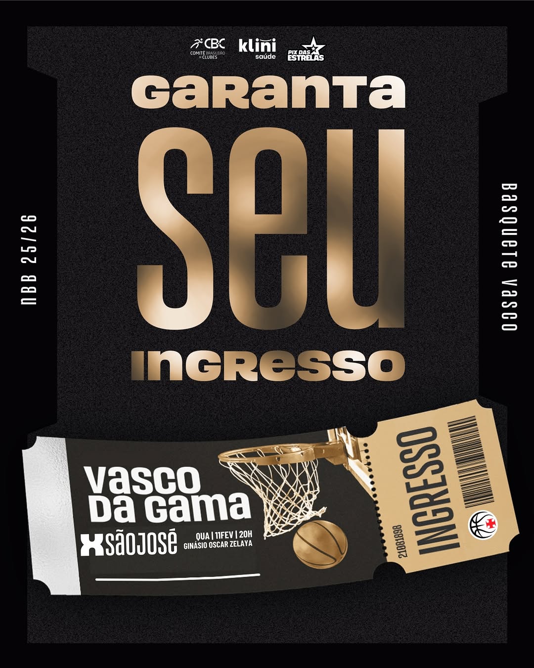 Quarta-feira (11/02) é noite de basquete. 💢🏀 O Vasco da Gama entra em quadra às 20h para enfrentar o São José, no Ginásio Oscar Zelaya, em Botafogo.