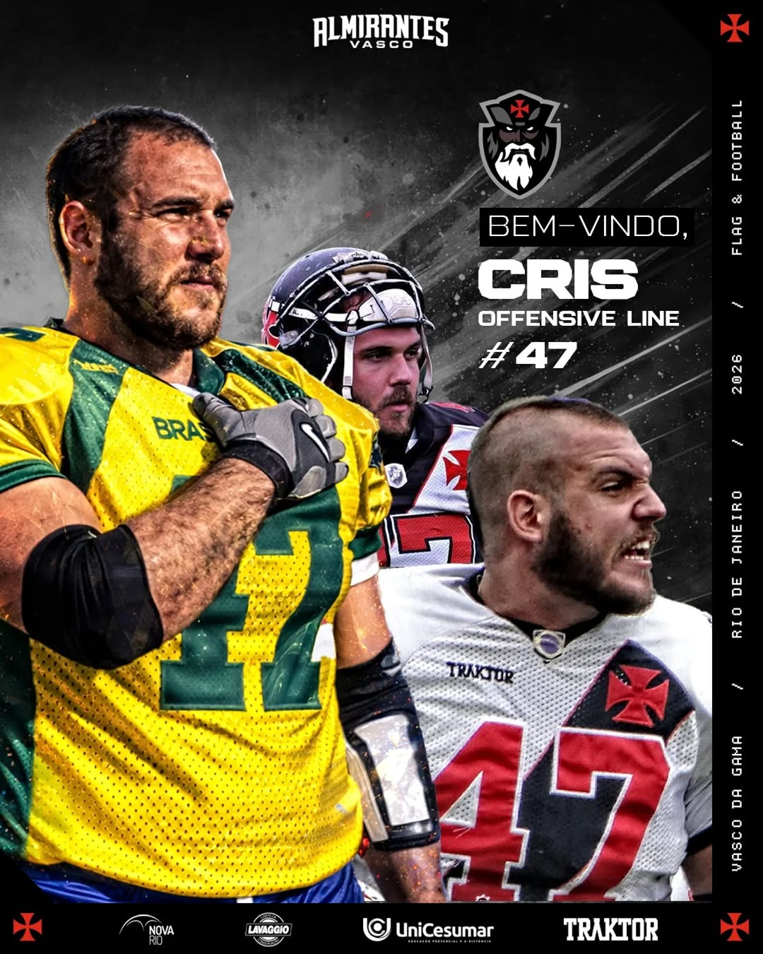 Cristiano Forti, o “Cris”, joga futebol americano há 23 anos e é um dos atletas que mais vezes vestiu a camisa do Vasco Almirantes. Presente desde o primeiro treino da equipe, em 2010, ele ajudou a construir a história do time dentro de campo.