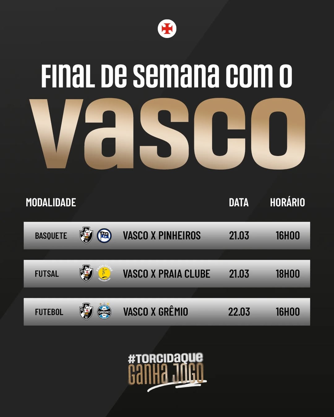 Vasco enfrenta o Grêmio no futebol, o Pinheiros no basquete e o Praia Clube-MG no futsal neste fim de semana