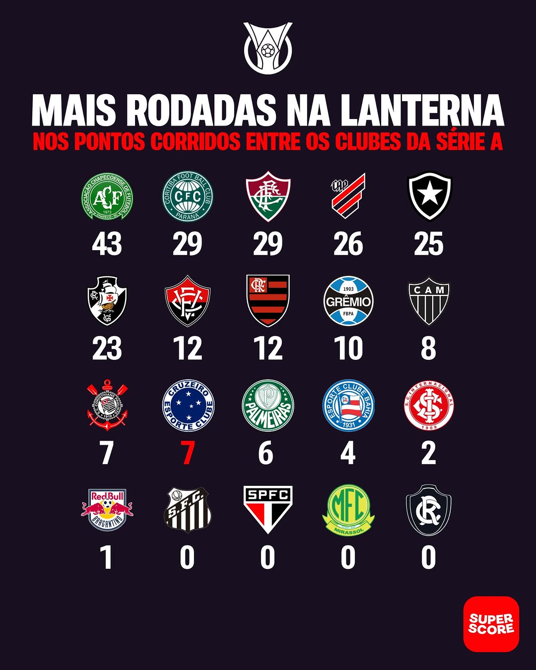 Sem vencer ainda no Brasileirão 2026, o Cruzeiro caiu novamente para a lanterna da competição. Veja o ranking dos times da Série A deste ano que mais vezes ficaram na lanterna na era dos pontos corridos.