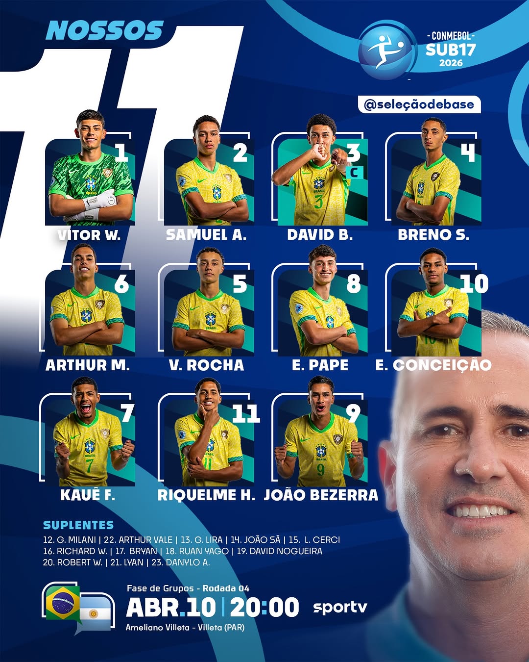 Breno Sales será titular da Seleção Sub-17 contra a Argentina nesta 6ª-feira pelo Sul-Americano