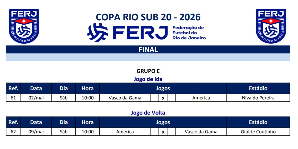 Já a final da Copa Rio Sub-20 será disputada com o America, em duas partidas. A FERJ agendou o primeiro jogo para sábado, dia 2 de maio, no Nivaldo Pereira, às 10h. A volta será no dia 9, também às 10h, no Giulitte Coutinho, pois o America fez a melhor campanha.